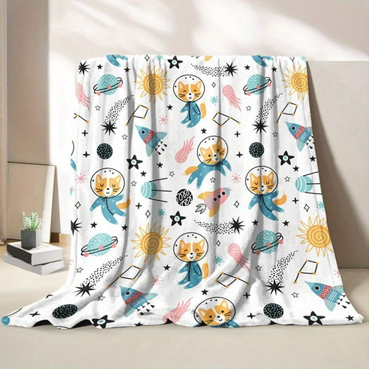 1 fluffy space cat and rocket print flannel blanket - warm and cozy, perfect for sofas, offices, beds, camping, and Christmas.