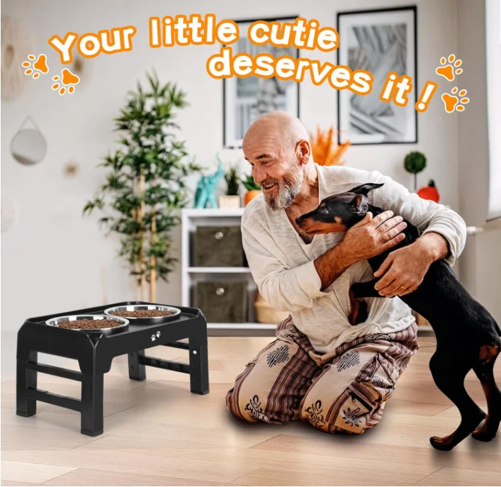 2 Thick 50oz Stainless Steel Food Bowls 4 Height Adjustable Raised Bowl Foldable Pet Rack Dog Food Bowl Feeding Black