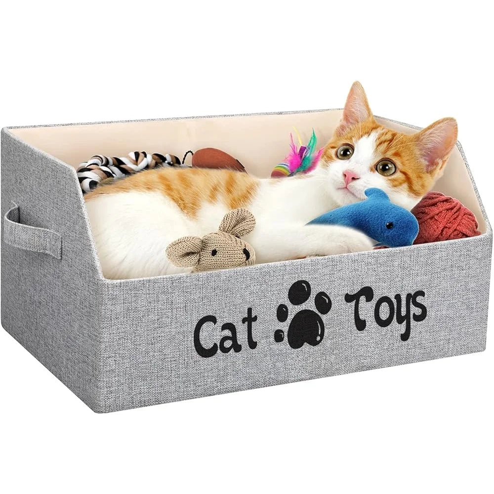 About this item ššššššš The cat toy box is made of high-quality tear-resistant linen fabric and 4MM thick pure natural cardboards without odor. The fabric is dirt-resistant and easy to wipe clean. Importantly, it can carry up to 22lbs of stuff due to the thick and stiff cardboards. Note: The newest pet storage basket has been extended the length from 16" to 19. 7" long. ššššš Size of 19. 7" (Length) x 11. 4" (Width) x 8. 6"/5. 1"(Upper Hight/Lower Hight) cat toy bin, which features the large capacity to keep all your cat's stuff relatively organized, such as cat toys, cat treats, collars, blankets or other pet supplies. š