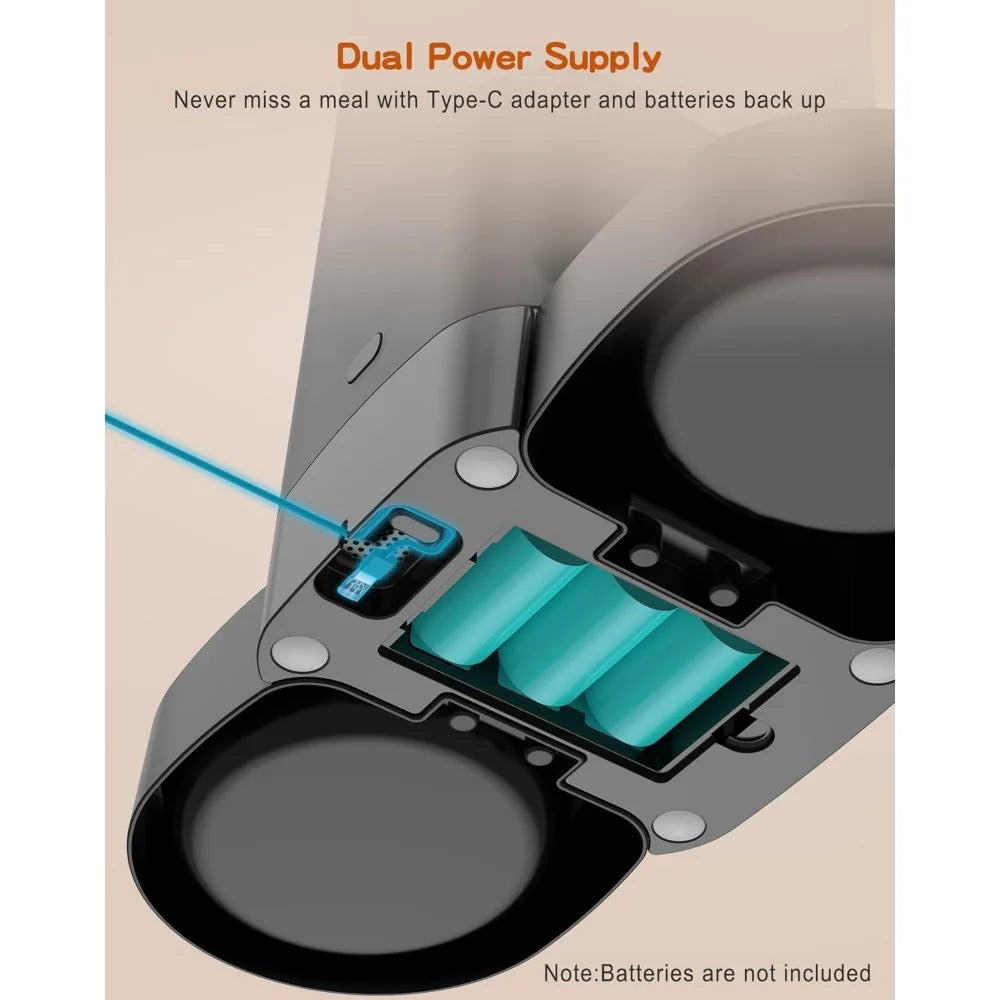 - [Dual Power Supply ] The timed cats feeder can be powered by USB power adapter and 3 alkaline D-size batteries (NOT Included). Once the feeding schedule is set, it is repeated every day. In the event of a power outage, the automatic feeder will automatically switch to battery power. For safety reasons, it is recommended to use Battery power sources. Battery alone can supply power for 200 days.No need to worry about your pet going hungry while you are away.
