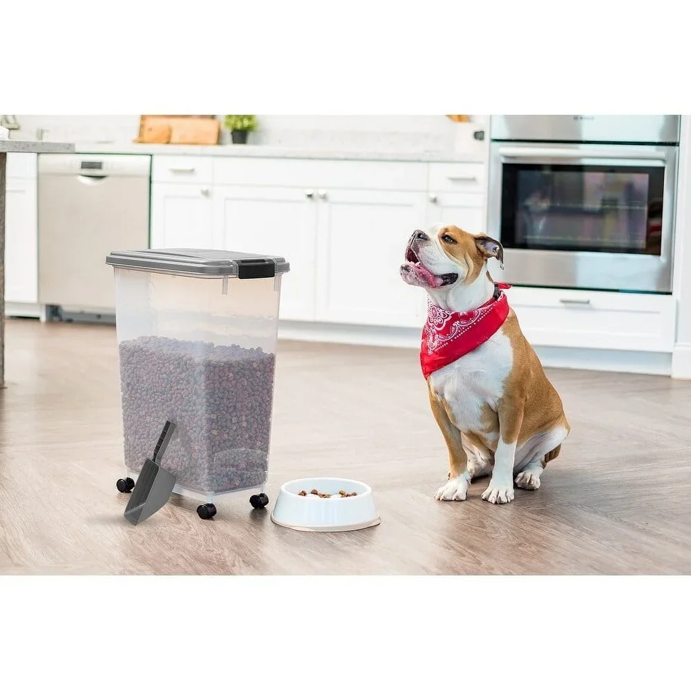 Airtight Pet Food Container 37.5L with Scoop Durable Storage Bin Dog Cat Easy Access Clear Body Wheeled Design