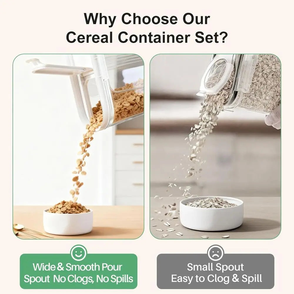 Wide Smooth Pour Spout for Easy Use - Each container has an upgraded wide spout compared to standard pantry containers. The spout allows for smooth pouring without clogging or spilling, and one-hand operation is possible due to the slim and portable design. These food storage containers with lids make dispensing cereal, pasta, or pet food incredibly easy.