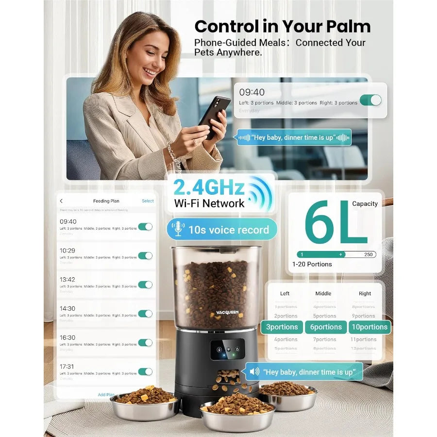 Large 6L Food Storage: Vacqueen cat feeder holds up to 25 cups of dry food, so you refill less often. Ideal for busy pet parents and great for households with multiple cats or small dogs.