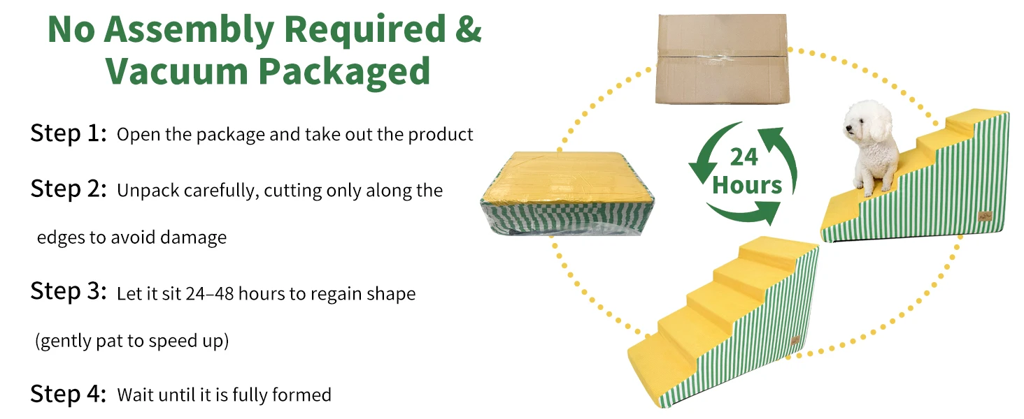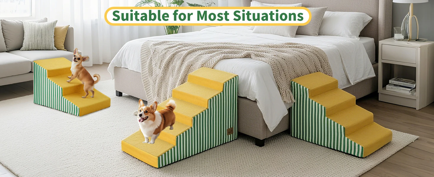 This dog stair is built with high-density sponge foam base, providing a lightweight yet sturdy platform that can support small dogs, puppies, even senior pets as they move up and down from elevated surfaces like beds, sofas, couches. The soft, textured cover offers a gentle surface for sensitive paws while also preventing slipping. Very practical accessory, enable pets enjoy more independence while protecting long-term health.