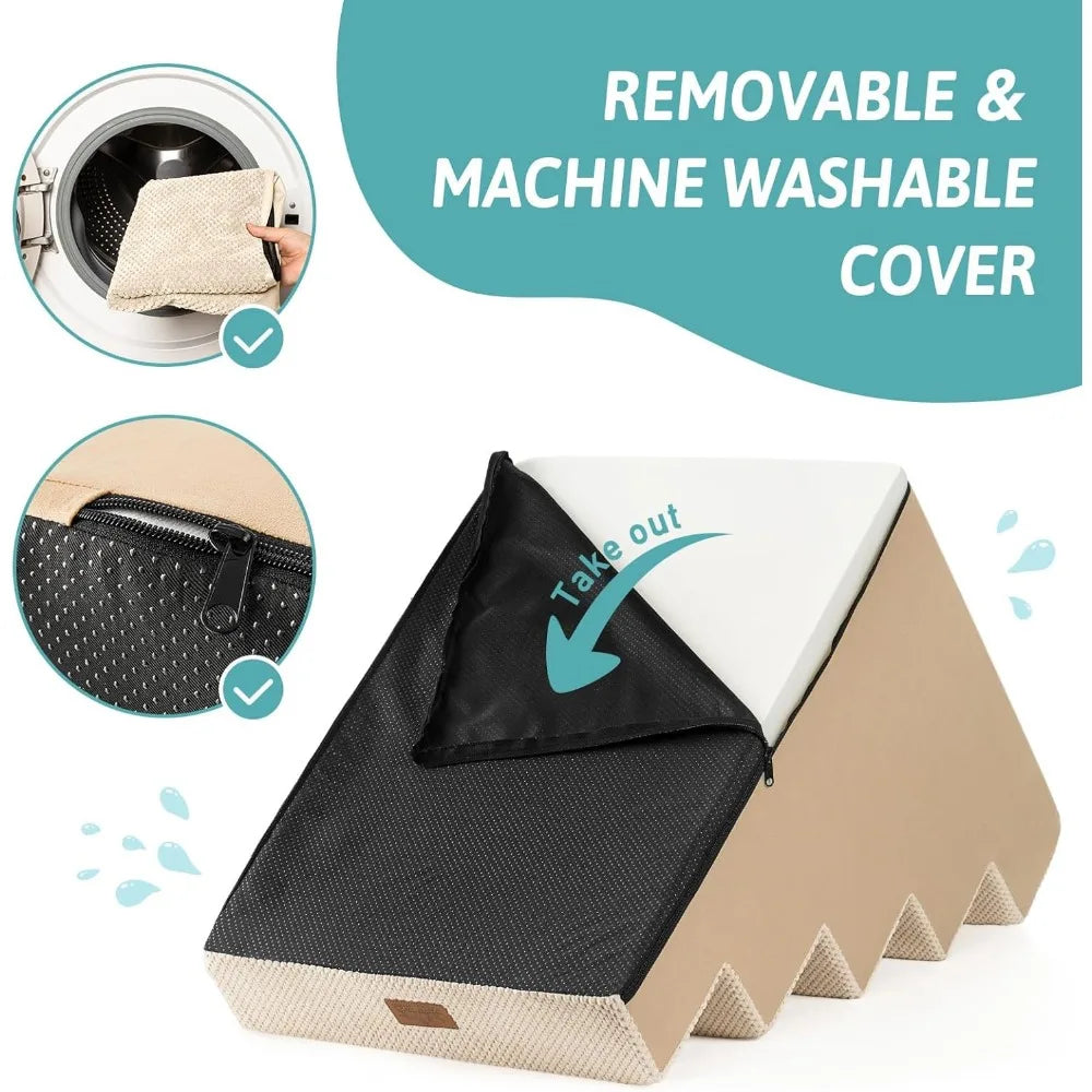 - Non-Slip Base and Removable Cover: Our dog steps for beds are equipped with a non-slip base featuring rubber dots for additional grip, minimizing movement during use. The pet steps cover is waterproof on the inner side, so you don’t have to worry about stains seeping into the foam. The outer cover is removable and machine washable for easy cleaning