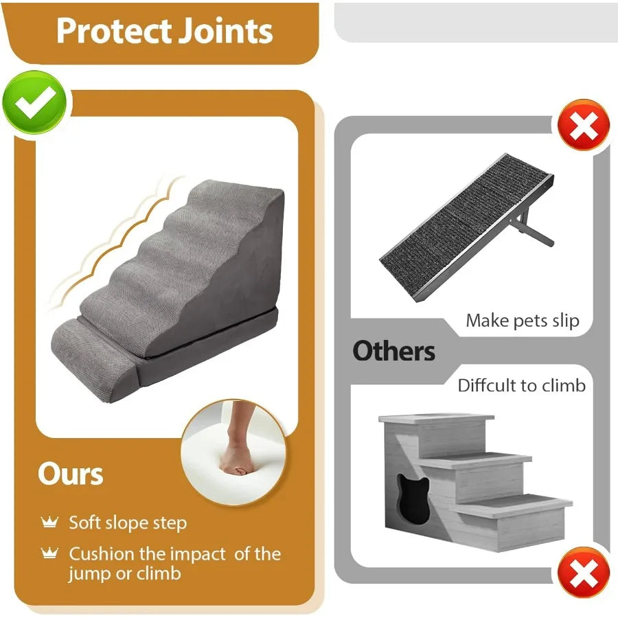 Anti-Slip & Stable: Our pet stairs are made of high-density sponge, which is molded in one piece to ensure stability and prevent collapsing. 35° slope design, reducing the burden on your dog's legs, allowing your beloved pet to climb the slope with ease. The smooth inclination angle is convenient for short-legged dogs such as corgis, dachshunds, pugs, and bulldogs, as well as elderly dogs