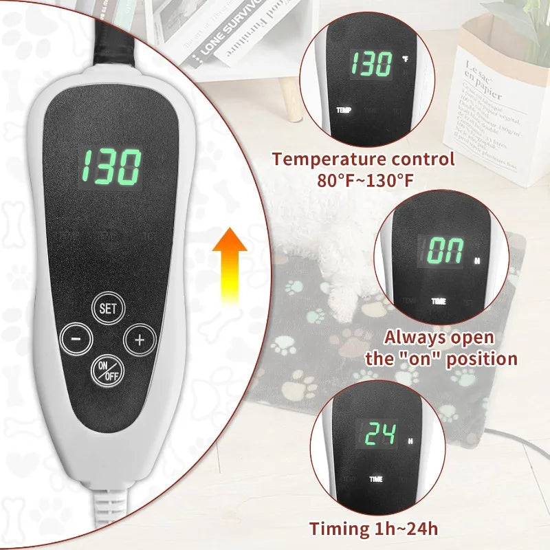 - INTELLIGENT CONTROLLER: our pet heating pad can set the temperature freely (increase 5℉ per level), provide 80-130℉, 1-24 hours free choice of on time duration, can be turned off automatically. Newly added "always on" mode (time display is on)