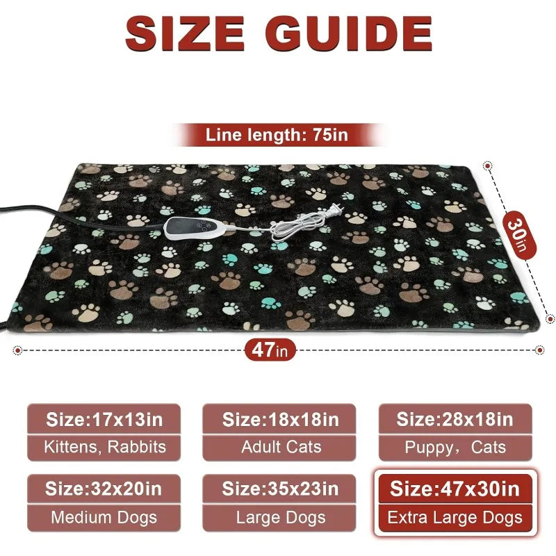 - UPGRADED CONFIGURATION:Extra Large Dog Heating Pad 47 x 30 inches (for adult extra large dog breeds, such as Central Asian Shepherd, Rambler, Newfoundland, Kennel Cousin, Caucasian, Greyhound, Labrador, etc.) With smart controller + built-in multiple thermostat sensors, reinforced power cord connection ports + protected wire rope for extra safety. Comes with a super soft cloth cover