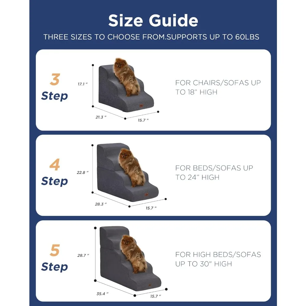 - MULTIPLE STEP SIZES - This dog stair has 3 steps, 4 steps and 5 steps to choose. Our 3-step stairs fits for chair/sofa/bed up to 17inch. 4-step stairs fits for chair/sofa/bed up to 23inch. And 5-step stairs fits for chair/sofa/bed up to 29inch.