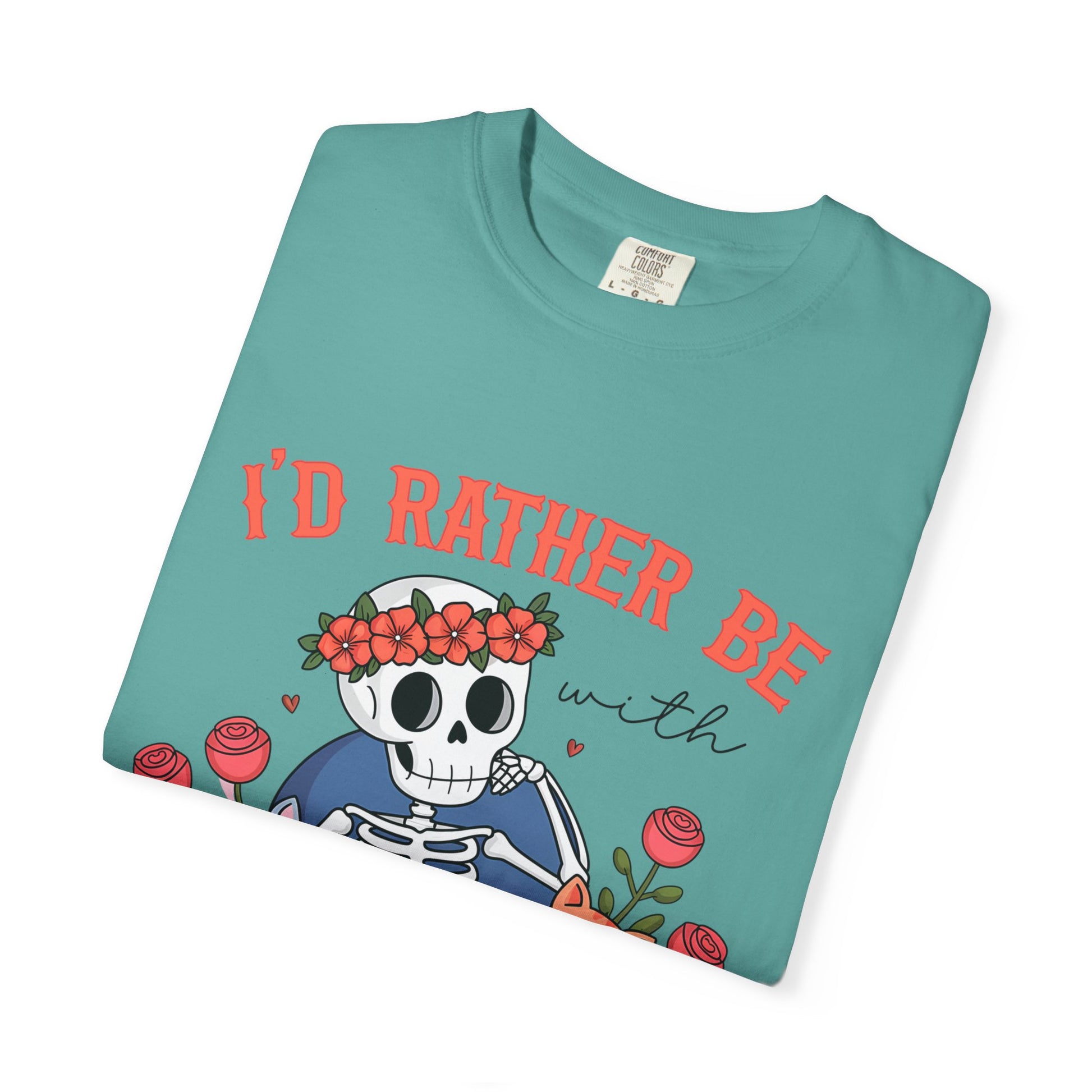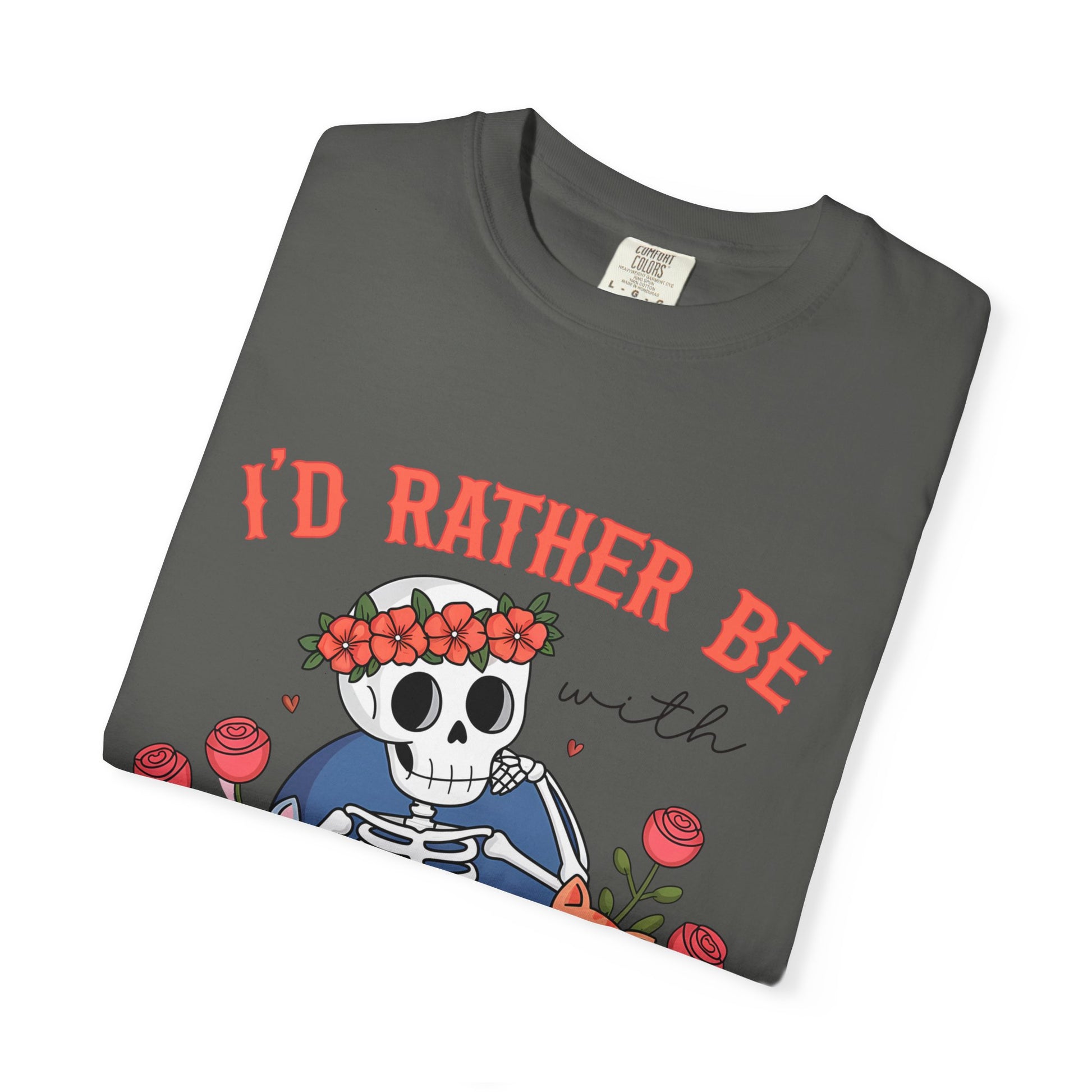 Soft, heavyweight cotton that feels lived-in from the first wear. This garment-dyed tee carries a playful, slightly spooky illustration: a smiling skeleton crowned with flowers, seated among mushrooms and two content cats beneath the text "I'd rather be with my cats." Wear it when you want to broadcast quiet humor and cat devotion — on lazy afternoons, at small gatherings with fellow cat people, or while curled up with your pets and a good book. The relaxed fit and pre-shrunk, ring-spun cotton make it comfortable for everyday wear. The muted, garment-dyed finish gives each shirt subtle variation in tone, so the colors age beautifully over time. It’s a casual statement piece for cat lovers who appreciate cozy, vintage-feel basics with a touch of dark whimsy.