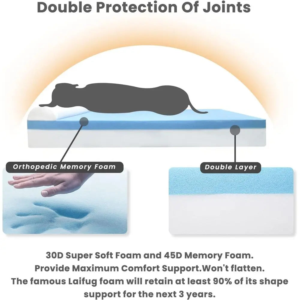 The bed features a multi-layered sponge construction, with a high-density base for support and a top layer of premium memory foam for comfort. This combination keeps your dog off the hard floor and cushions their body, providing relief for tired muscles and joints. The memory foam's viscoelastic properties offer support in all directions, while the high-quality sponge retains its shape after use.