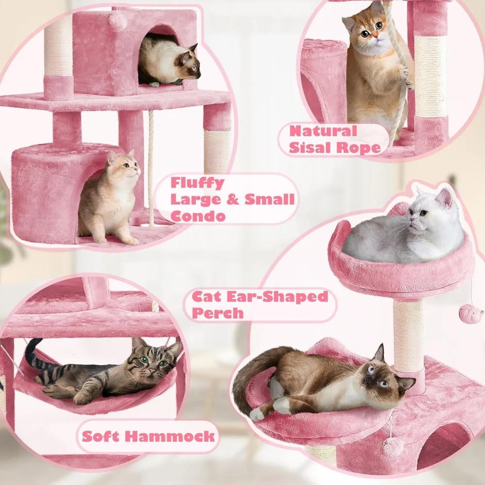 Discover our multi-level cat tree tower, designed to provide your feline friends with a sweet and cozy retreat, as well as an activity center to keep them entertained. This cat tree features two cat-ear-shaped perches for relaxation, two fluffy condos, and a soft hammock for hiding. The tower also includes five sisal scratching posts at different heights to encourage natural scratching behaviors and protect your furniture, along with two interactive bungee cords equipped with jingly balls and sisal twine for playtime fun. Built with a strong and stable baseboard measuring 24 inches in length and 19.5 inches in width, this cat tree is constructed to withstand active play. For added security, a safety strap is included to secure the tree to the wall. The materials used are carefully selected, including CARB P2-compliant particle board, natural sisal, and soft, pet-friendly plush fabric, ensuring a safe and comfortable space for your pets. This cat tree is an ideal choice for families with multiple cats, as it mimics the natural outdoor environment and expands the vertical activity space within your room.