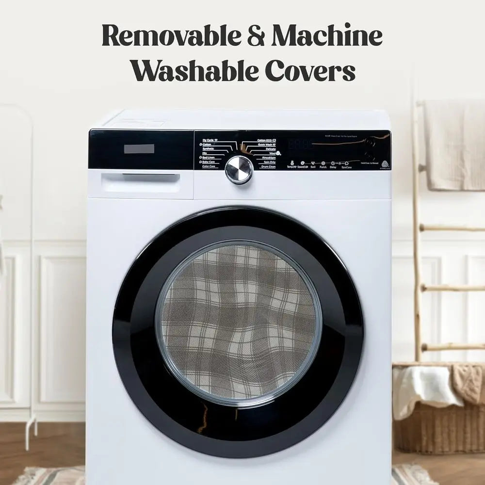 Stylish and Durable Design - Crafted from eco-conscious recycled polyester canvas, the bed is soft, tear-resistant, wrinkle-free, and built for lasting durability. Available in four exclusive designer patterns (Grey Plaid, Light Blue Check, Navy Plaid, Pink Check) and three sizes—Small, Medium, and Large—to seamlessly blend with any home décor.