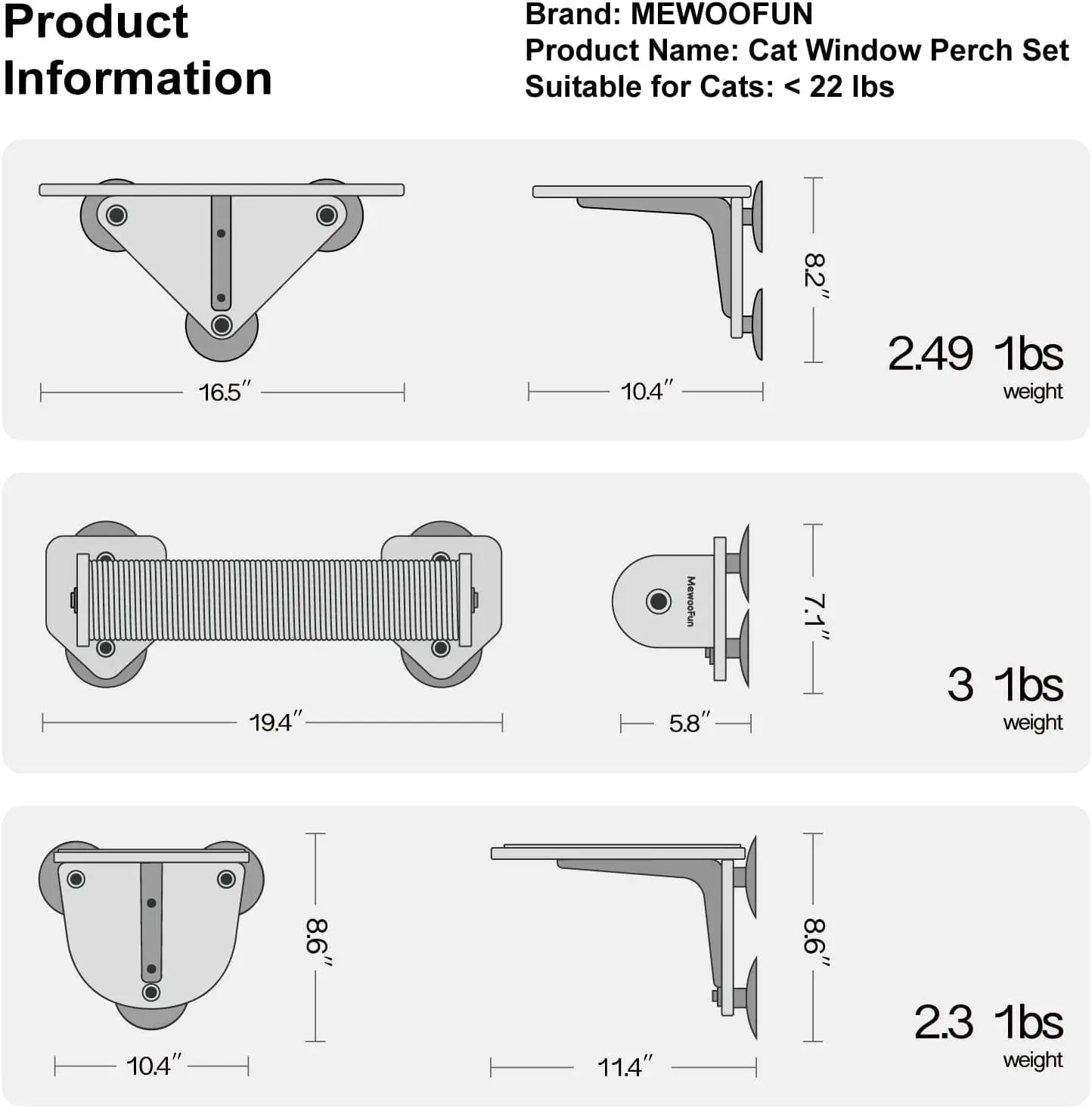 - **Ideal for Active Cats:** Creates a comfortable space for your cat to rest and play. Perfect as a gift for your beloved feline companions. Dimensions: Cat window perch 16.5" x 10.4" x 8.2", climbing step 10.4" x 11.4" x 8.6", scratching post 19.4" x 5.8" x 7.1",Cat Double Step 14.96" x 7.28" x 4.72", Cat Single Step 9.76" x 7.36" x 6.93" ,Bed 23.03" x 15.35" x 6.10".