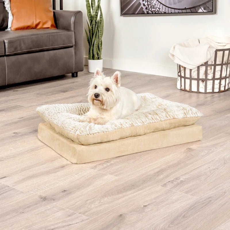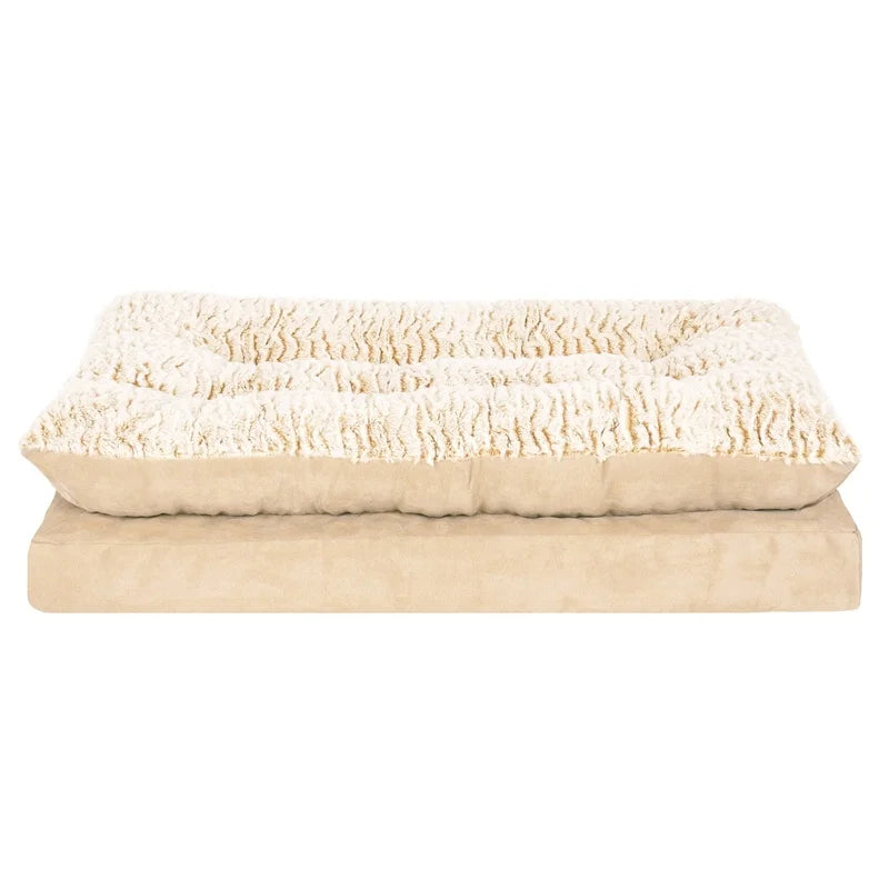 FOR DOGS AND CATS: This dog bed features a tufted pillow cushion atop a supportive mattress base to provide utmost comfort and support for pets of all ages; designed with a non-skid base to help keep it in place SLEEP SURFACE: The embossed faux fur pillow surface is plush and oh-so-soft; the fabric is gentle on noses and paws for enhanced snuggling comfort EASY ON JOINTS: The pillow top provides an extra layer of support to help relieve aching joints; it sits atop an egg-crate orthopedic foam base, which helps cushion pressure points and improve circulation for a good night's rest PRODUCT DETAILS: Orthopedic Dog Bed, Taupe; Medium – 30" x 20" x 3" AVAILABLE VARIANTS: The dog bed comes in Taupe and Gray; it's also available in Medium, Large, and Jumbo EASY CARE: The removable dog bed cover (and attached pillow cushion) is completely machine washable for your convenience; for more specific care instructions, please refer to the hang tag and/or seam label if applicable
