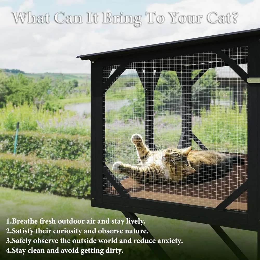 This cat enclosure is made from sturdy Finnish spruce, known for its durability and resistance to pests due to the tight grain from slow growth in cold climates. It's designed for window installation, offering a secure outdoor space that prevents escapes and protects your cat from external threats. The spacious and ventilated design provides ample room for your cat to move around, sunbathe, nap, and enjoy the view, with mesh sides for good airflow and security. The grey coating on the enclosure is weather-resistant, protecting it from moisture and UV rays, and it's non-toxic, ensuring your pet's safety. Installation is straightforward with a provided guide and hardware, and you can rely on our 1-year warranty and 24/7 customer support for any assistance needed.