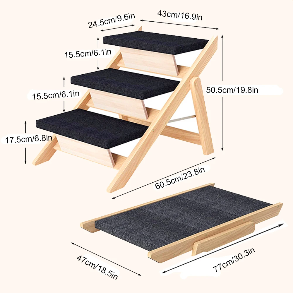 Features: 1.Premium Wooden Construction: Our dog stairs are a safer, eco-friendly, and more convenient alternative to typical bed ladders or couch ramps. Made from high-quality wood with non-slip tips on the legs to ensure stability for your pet. 2.Extra Help for Your Pet: The wooden cat climbing ladder assists pets in playing, climbing, or snuggling on the couch, providing support to achieve even very high surfaces, allowing deeper connections between you and your pets. 3.Portable and Foldable Design: Fold these portable pet ladders for easy storage or travel, place them in the car, or take them to the porch or garden. They are lightweight and require no equipment for setup. 4.Warm Home Aesthetic: Our carpeted ramp ladders complement any decor, especially cozy and family-friendly indoor settings. Unlike bulky alternatives, the folding design seamlessly blends with home designs. 5.Versatile Usage: Pet ramp stairs are designed to fit different spaces and situations, offering convenience and adaptability. Whether inside or outdoors, they enhance accessibility for your beloved pets. Specification: Origin: Mainland China Third-Order Product Size: 605.00x505.00x430.00mm/23.82x25.98x19.88inch Fourth-Order Product Size: 770.00x660.00x430.00mm/30.31x25.98x16.93inch