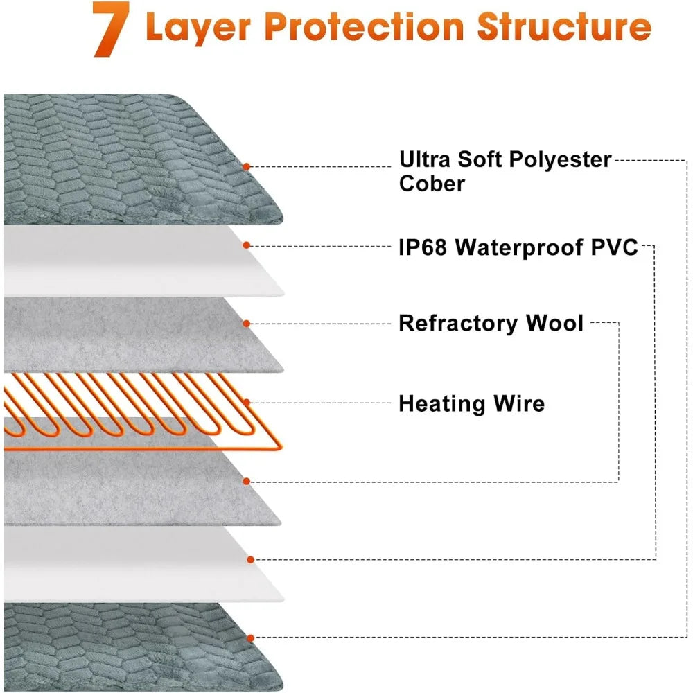 - 🐶【7 layer Protective Structure】The pet heating pad is made of soft velvet cover, waterproof PVC enclose, refractory wool and heating wire. Flame Retardant & Waterproof PVC heating pad has the highest-grade V-0 flame retardant capability with UL-certified heating wire to protect pets from burns. The cord is made from chew resistant steel and can protect your pet from electric shocks if it tends to chew on cables.