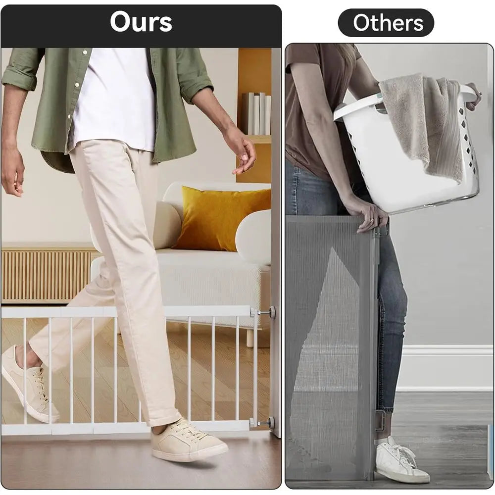 【Durable and Safe All-Steel Frame】Made with a reinforced metal frame, this dog gate is sturdy, stable, and resistant to knocks. Its pet-friendly design features smooth, rounded edges for extra safety.