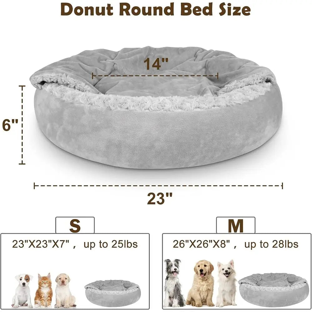 Small Dog Bed Cat Bed with Hooded Blanket, Cozy Cuddler Luxury Puppy Pet Bed, Donut Round Calming Anti-Anxiety Dog Burrow Cave B